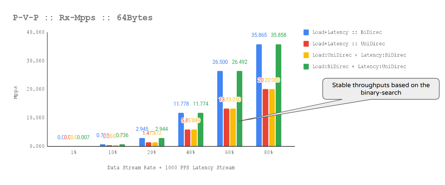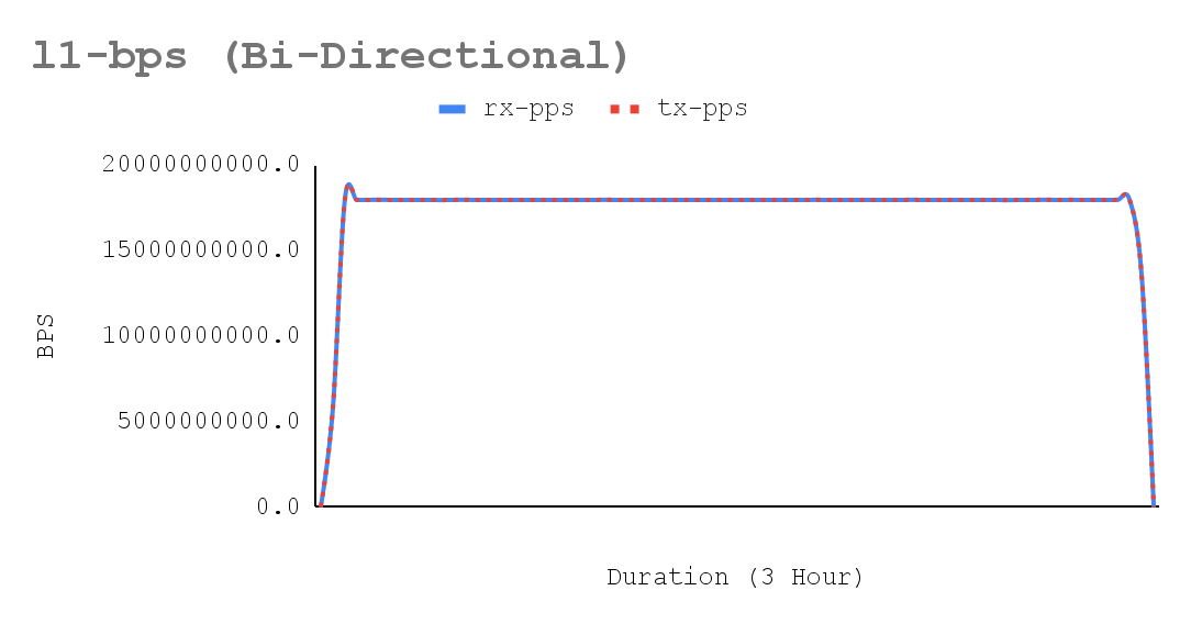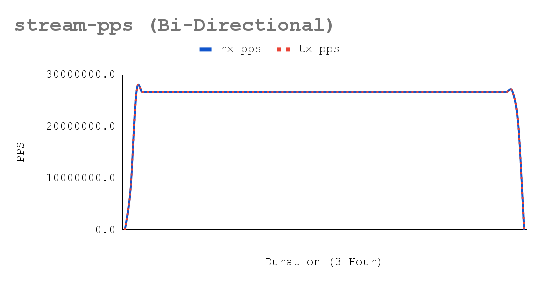 trafficgen-trex-profiler tx-cpu-util 14.01- Figures 5-7 show a sustained network throughput test, using the trafficgen-trex-profiler metrics types, demonstrated the deterministic stability of performance over the test duration. The x-axis of the accompanying chart plots 3-hour validation time across 70 resolutions collected by crucible metrics, confirming consistent results for bi-directional traffic. Key metrics tracked include Stream-PPS, L2-BPS (Layer 2), and L1-BPS (Layer 1).