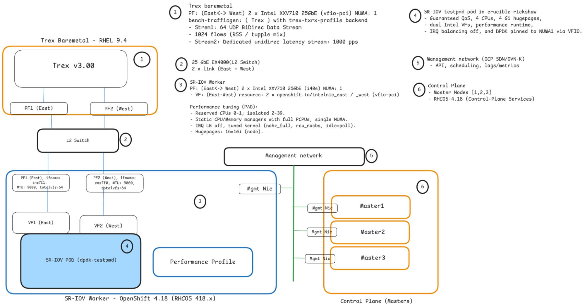 The network topology is designed for achieving consistent, low-latency dataplane performance in OpenShift. This approach transforms a standard OpenShift cluster into a high-performance platform suitable for rigorous network performance testing, focusing on low-latency measurement utilizing Trex's default software time stamping (Figure 1).