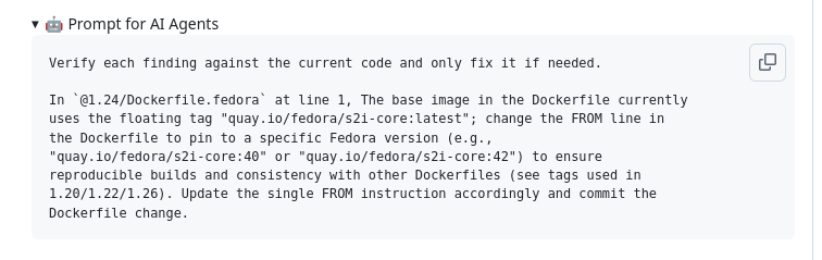 CodeRabbit AI also creates prompts for other AI agents whenever it detects a new find. This can be used to double check the suggested changes and the finds themselves with other agents easily.