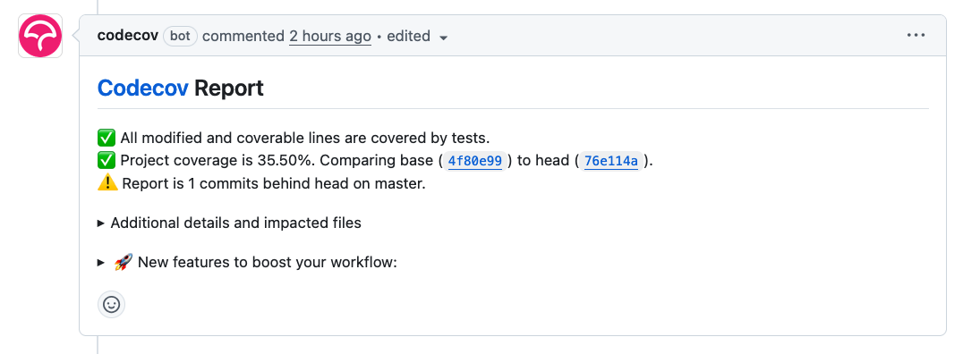 Now in each pull request when a code is changed, CodeCov adds a comment about test coverage. Figure 6 shows how the changed code is covered.