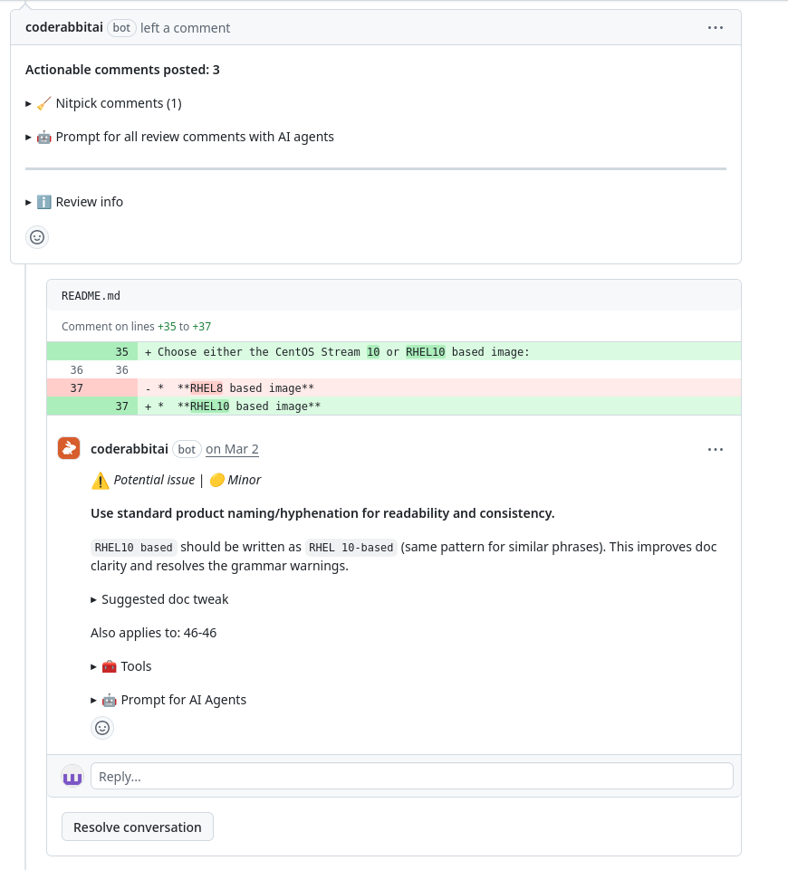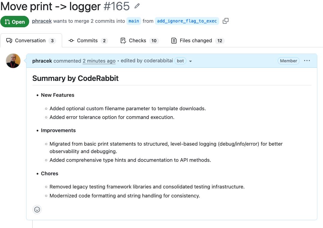 We have tested CodeRabbit on multiple pull requests ranging from simple changes to the README to advanced Python code changes. This one was not ground breaking, but it was still interesting to see how CodeRabbit would handle working with changes that do not necessarily affect code, yet they still have to be concise and structured. This shows that CodeRabbit maintains the sanity of your project even beyond the code.