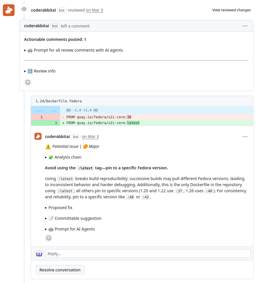 View the experiment with a Dockerfile and how CodeRabbit AI handles the FROM directive of the Dockerfile. Figure 8 shows how the CodeRabbit AI suggest changes in a Dockerfile.