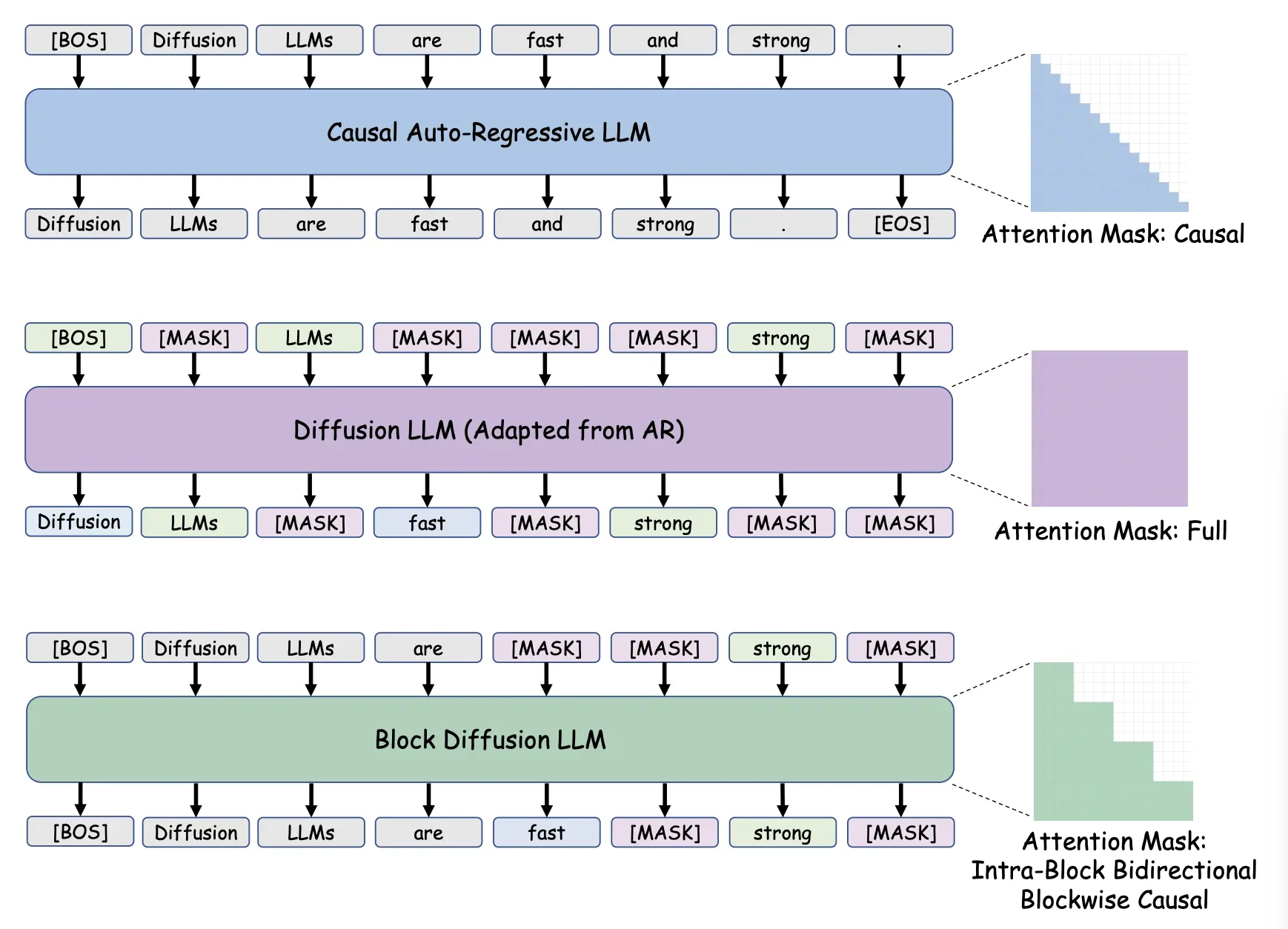 Figure 1 shows the progression from a standard causal mask of auto-regressive models to the full bidirectional mask of early diffusion LLMs.