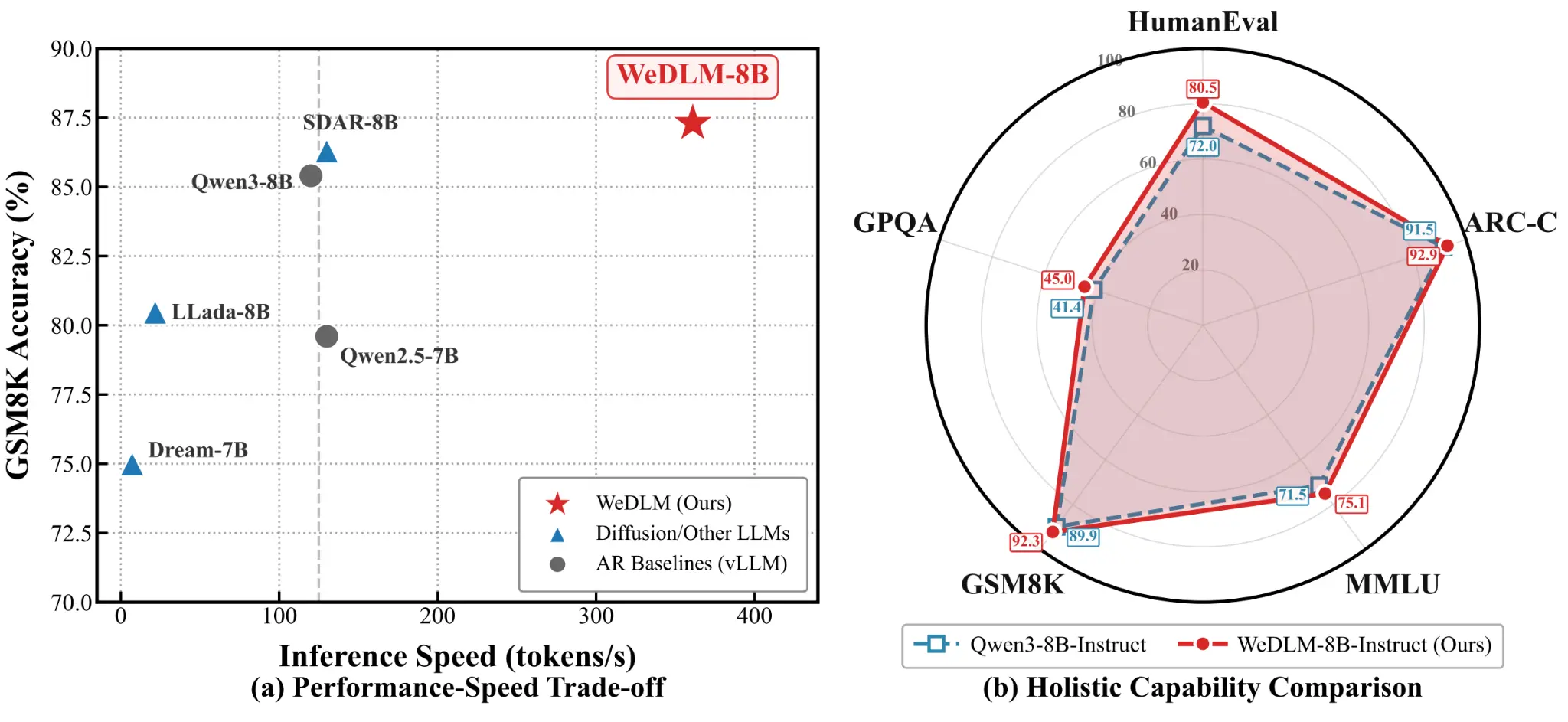 We're seeing trending dLLMs like the open source LLaDA 2.X hitting over 800 output tokens per second (TPS), while the Mercury 2 is crossing the 1000+ TPS threshold. When looking at the data, models like WeDLM and LLaDA 2.1 are outperforming baseline vLLM auto-regressive models, as shown in Figure 3.