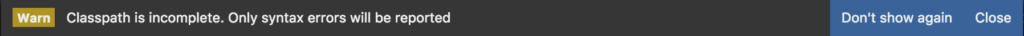 Should you change your mind, it's possible to modify that choice in VS Code's user settings: The java.errors.incompleteClasspath.severity key specifies the severity of the message when the classpath is incomplete for a Java file. Supported values are ignore, info, warning and error.