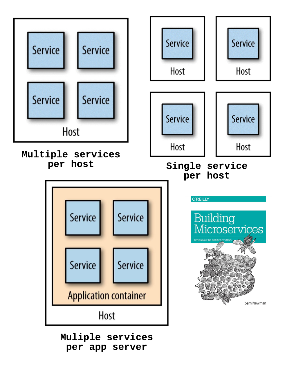 One of my favorite Microservices related books is Building Microservices by Sam Newman. In the book, Sam approaches Microservices from all possible angles and one of those is deployment. In the Deployment chapter, the author describes few strategies for mapping services to hosts and their pros and cons.
