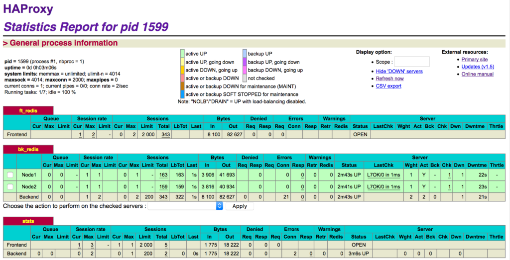 - HAProxy can be reached at http://(node3IP):9000/haproxy_stats