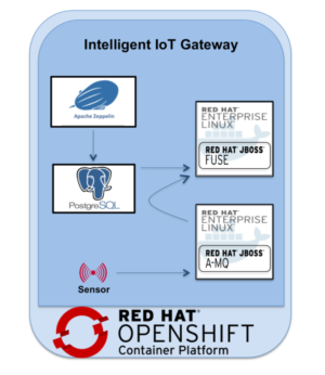- Red Hat JBoss A-MQ: Apache ActiveMQ-based message broker container image for receiving and storing telemetry from the sensor via the MQTT protocol.