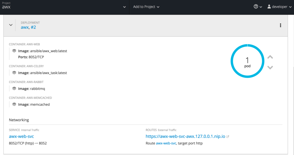 The installation also creates the network service and a route to have access to the AWX Web console.