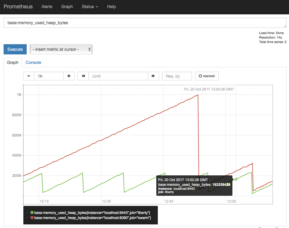 In the last chart, you can see that we only asked for the metric,base:memory_used_heap_bytes but got two graphs, one per MP-server, as both expose the same metric under the same name. Prometheus is adding labels on the fly, which can then be used to distinguish the servers (green is OpenLiberty, brown is Swarm).