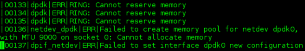 |dpdk|ERR|PMD: ixgbe_alloc_rx_queue_mbufs(): RX mbuf alloc failed queue_id=0 |dpdk|ERR|PMD: ixgbe_dev_rx_queue_start(): Could not alloc mbuf for queue:0 |dpdk|ERR|PMD: ixgbe_dev_start(): Unable to start rxtx queues |dpdk|ERR|PMD: ixgbe_dev_start(): failure in ixgbe_dev_start(): -1 |netdev_dpdk|ERR|Interface dpdk0 start error: Input/output error