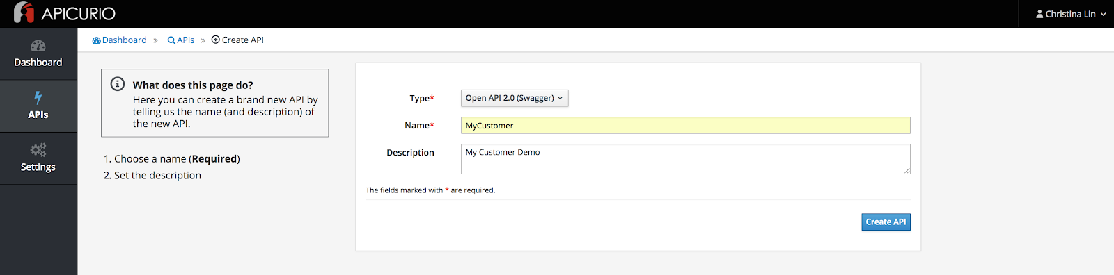 After registering, you will be redirected to the main screen of Apicurio. Then, after discussing with the consumer what they wish to have for the customer service, you can start creating the contract by clicking Create New API.