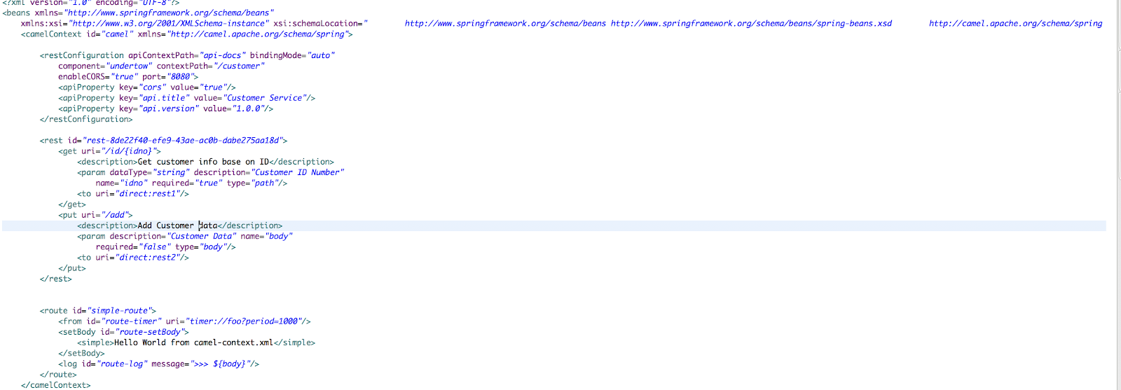 <restConfiguration apiContextPath="api-docs" bindingMode="auto" component="undertow" contextPath="/customer" enableCORS="true" port="8080"> <apiProperty key="cors" value="true"/> <apiProperty key="api.title" value="Customer Service"/> <apiProperty key="api.version" value="1.0.0"/> </restConfiguration>