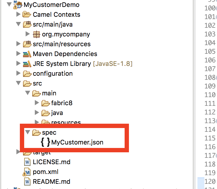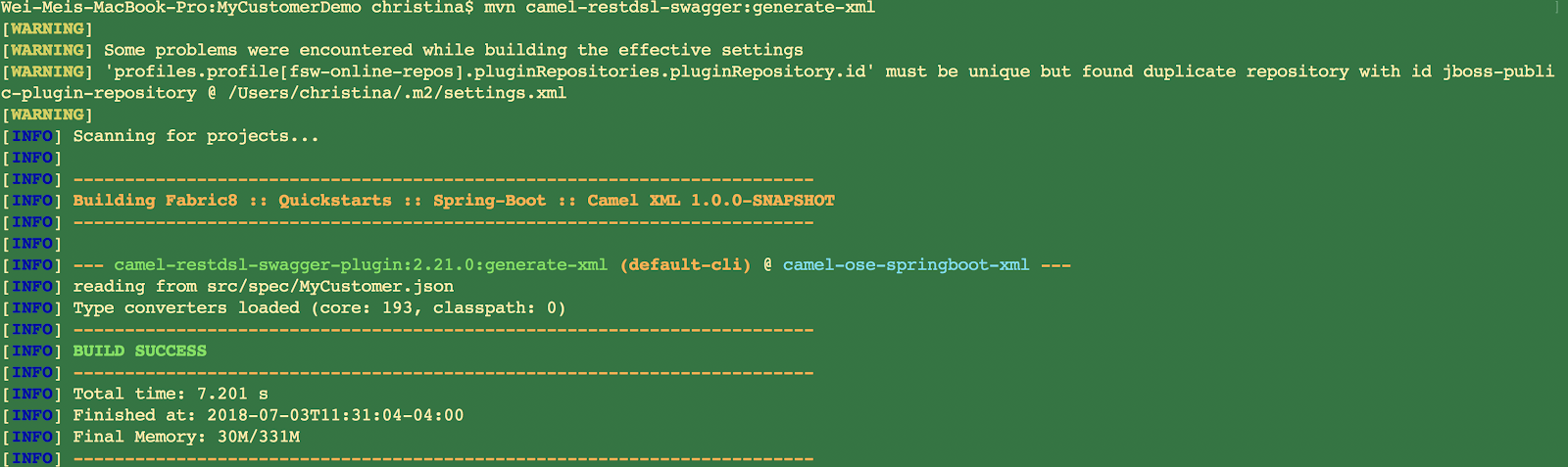 <plugins> .... <plugin> <groupId>org.apache.camel</groupId> <artifactId>camel-restdsl-swagger-plugin</artifactId> <version>2.21.0</version> <configuration> <specificationUri>src/spec/MyCustomer.json</specificationUri> <fileName>camel-rest.xml</fileName> <outputDirectory>src/main/resources/spring</outputDirectory> </configuration> </plugin> .... </plugin>
