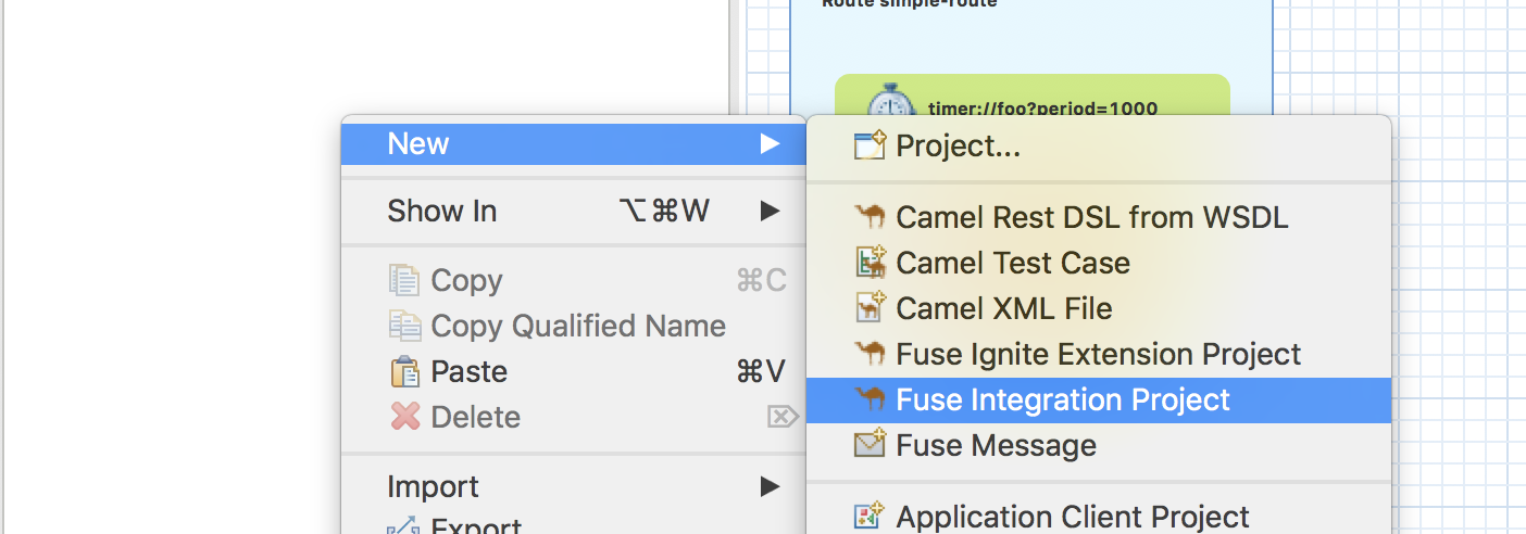 Go to Red Hat Developer Studio and create a new Red Hat Fuse project by right-clicking in the navigation panel and selecting New->Fuse Integration Project.