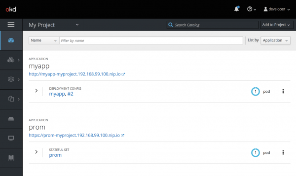 OpenShift comes with a Prometheus instance already available. However, this instance has been optimized for instrumentation of the Kubernetes system itself. As a result, for our purposes, we will install a standalone Prometheus server in our OpenShift project and point it at our application.