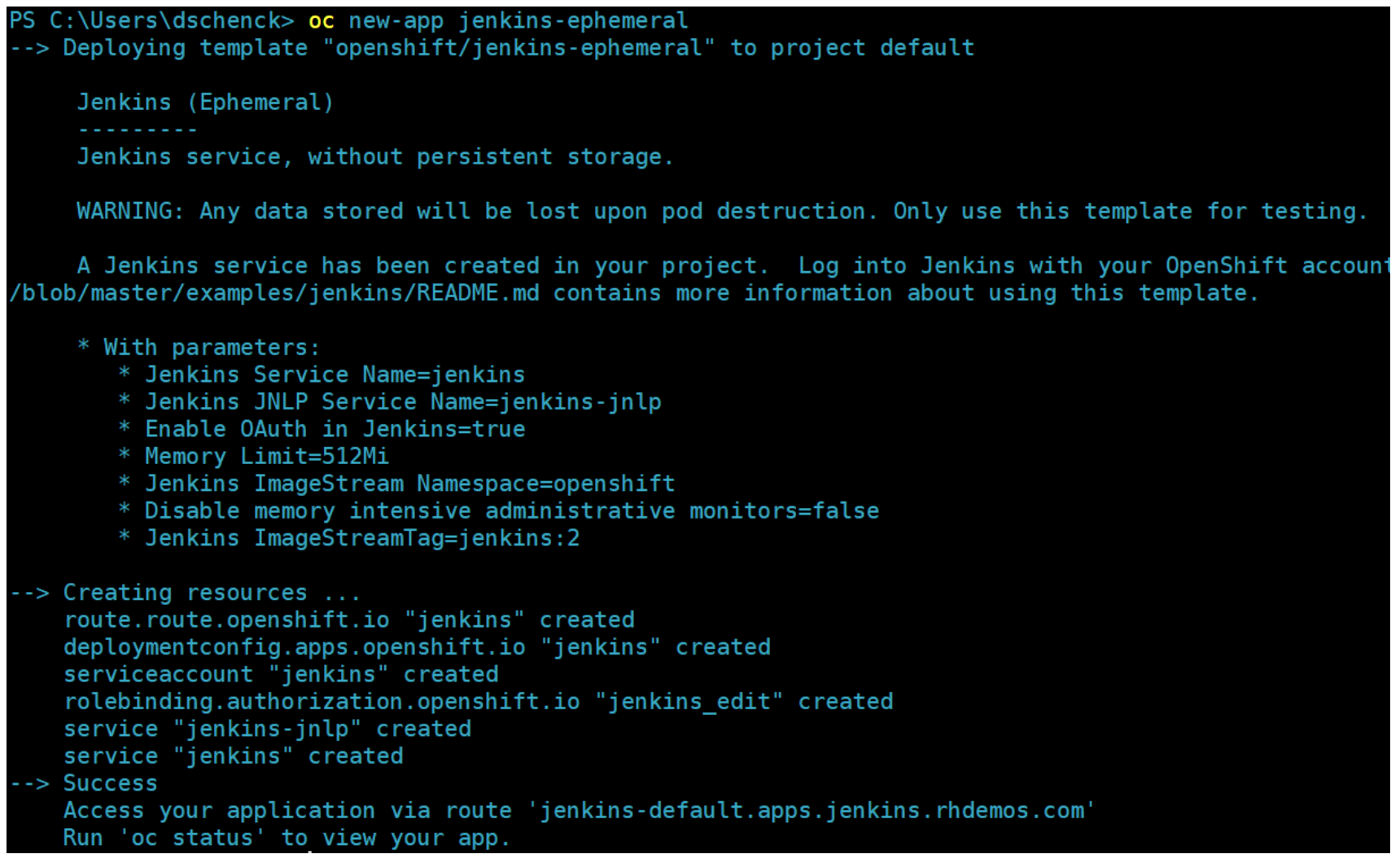 Because we don't have persistent storage configured (that's yet another article), we'll use the "Jenkins-ephemeral" template for this article. The fundamentals are the same, and the knowledge is transferable, but this way we spend our time in this article on Jenkins and CI/CD and not on creating and configuring and using persistent storage.