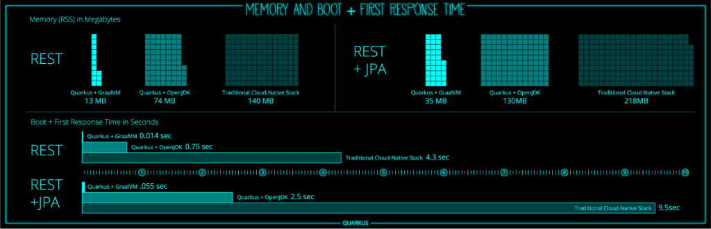 Historically, the heavy and slow Java runtime had significant drawbacks compared to Go, Javascript, and other light runtimes in the serverless space. That is one of the main motivations for Oracle to create GraalVM/Substrate VM. Substrate VM is a framework that enables ahead-of-time (AOT) compilation of Java applications into native executables that are light and fast. Then a recent effort by Red Hat led to creation of the Quarkus project, which further improves resource consumption, startup, and response times of Java applications mind-blowingly (a term not used lightly here).