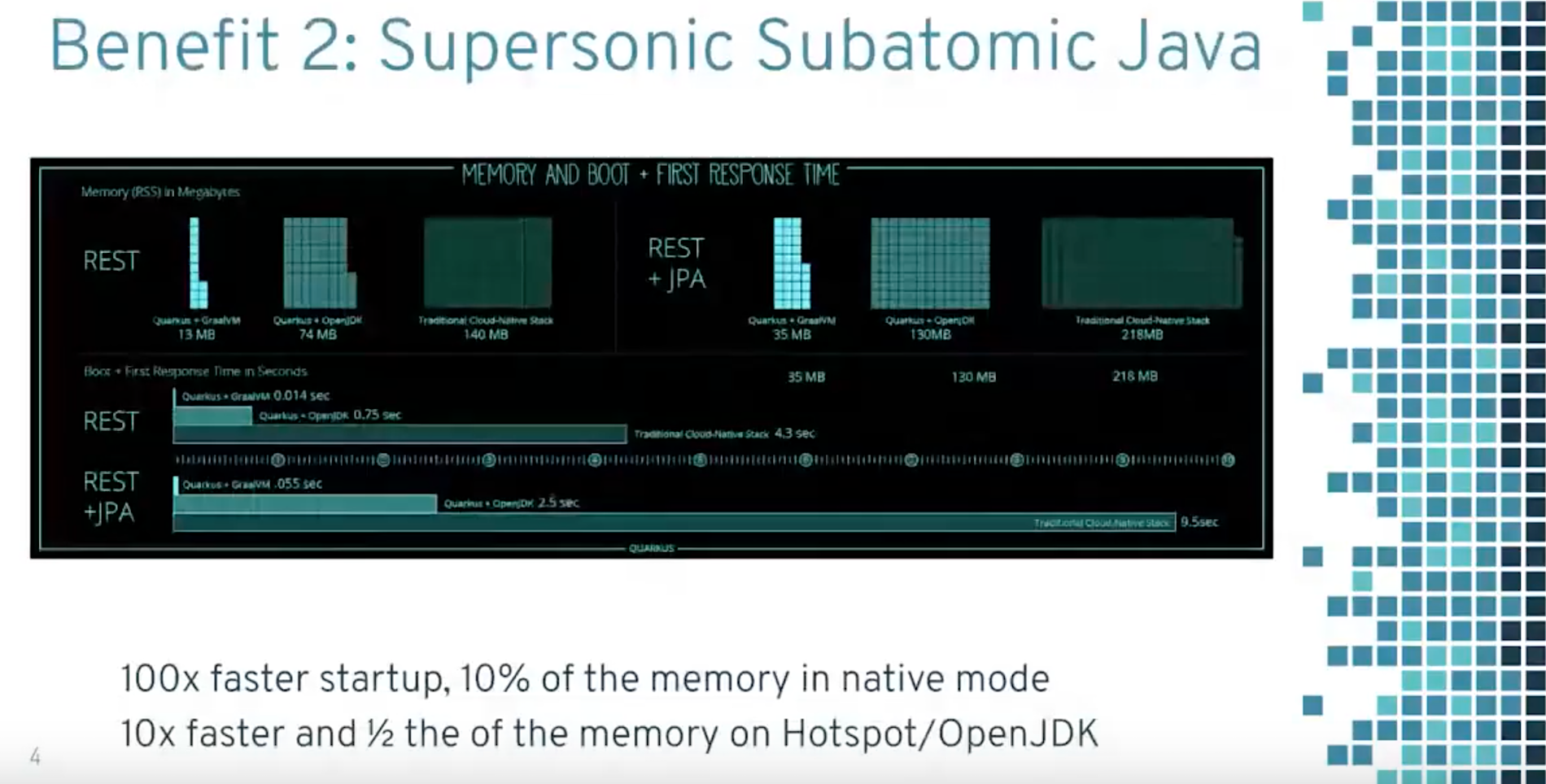 Not only does Quarkus boot extremely fast and with low memory footprint, but it also brings supersonic development time to developers with live reload, fast tests, and streamlined code for 80% of common usages.
