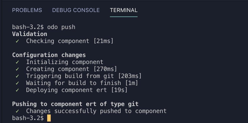 Note: All component configurations are saved to /.odo/config.yaml. You can commit this file to your repository to easily recreate components with the same configuration later, or to share it with someone else.
