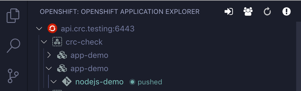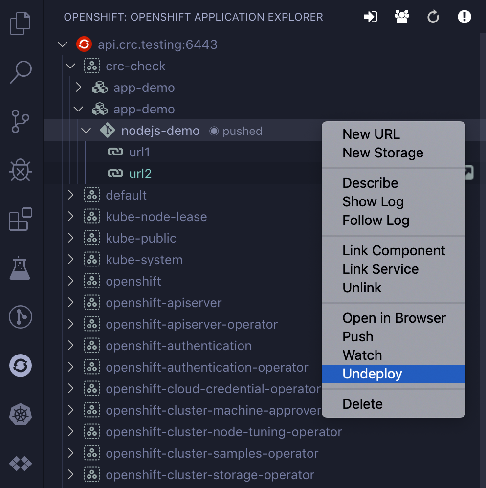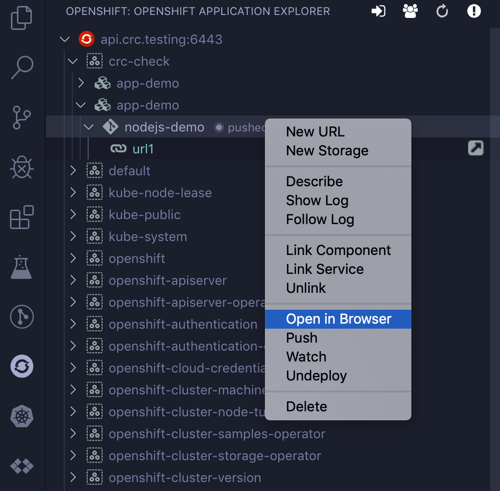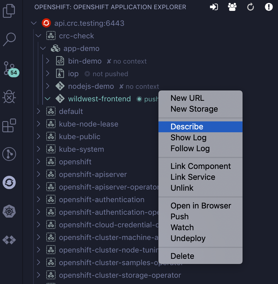 For easier management of Kubernetes resources, users can use the Kubernetes explorer (added as a dependency), which is accessible from the VS Code Activity Bar. This explorer lets you access information about your Kubernetes clusters and resources. You can set an active OpenShift Project, stream and view its logs, start and stop builds, and much more. Here is a selection of the actions available for interacting with your OpenShift resources: