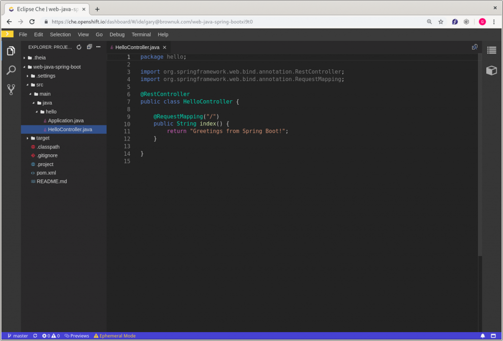 To start the workspace on che.openshift.io, point a browser to this url. Chrome is recommended due to issues on some versions of Firefox.