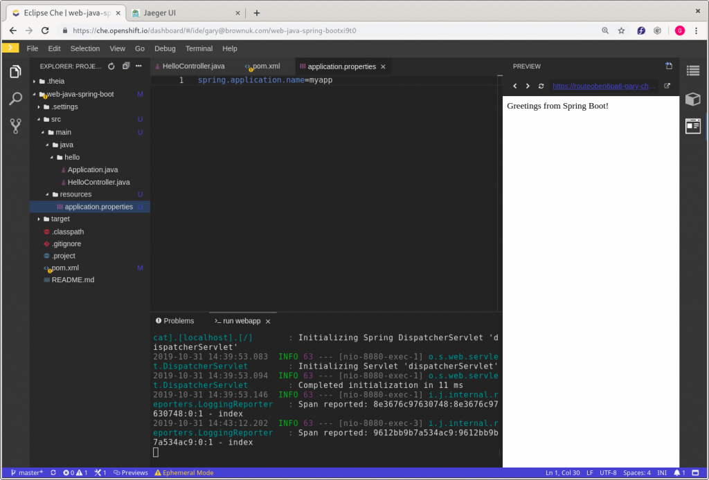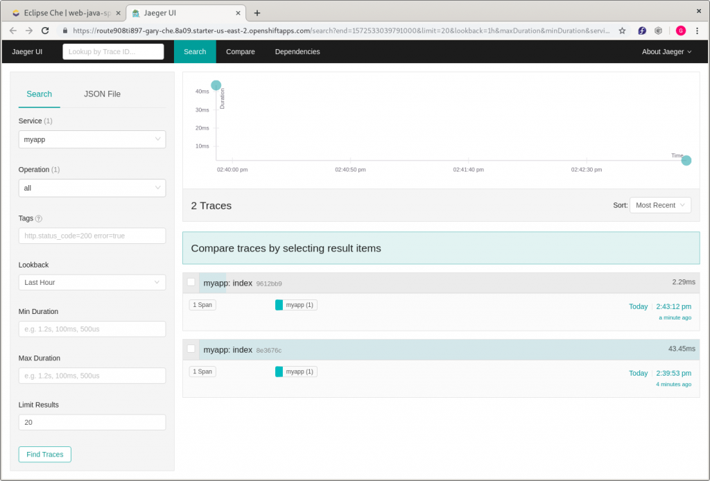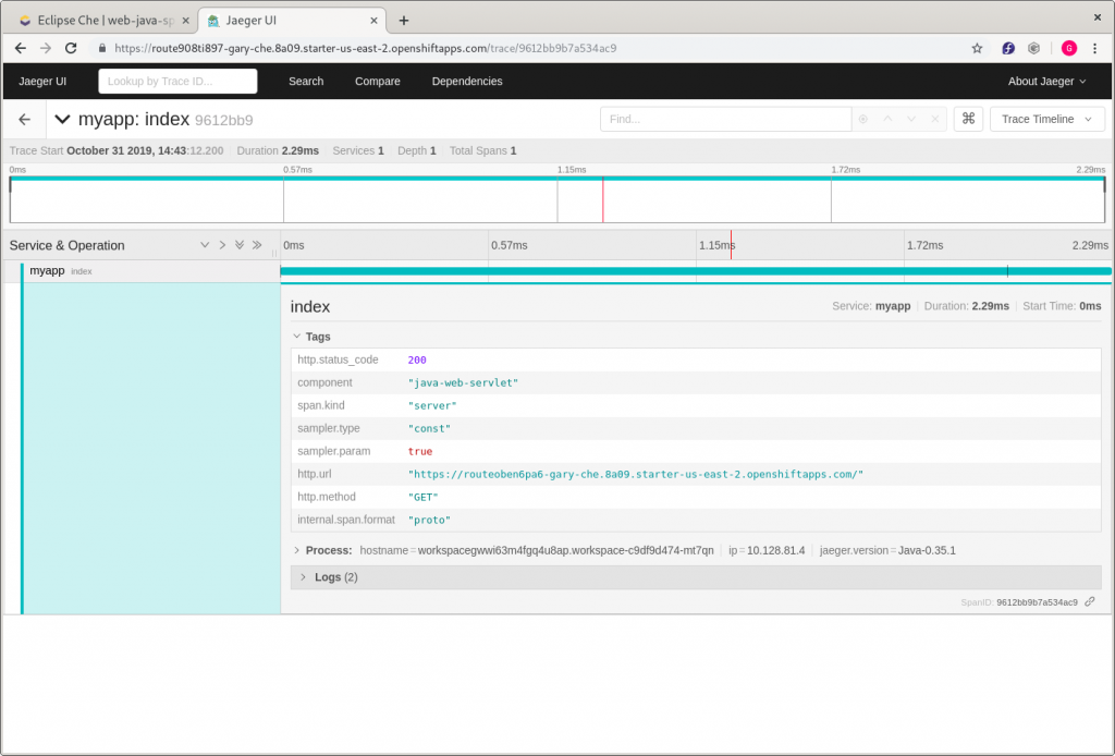 This particular example is simple and only captures tracing from a single service. The benefit offered by Che is enabling complete applications (multiple services) to be used within the same workspace, thus producing more interesting traces and helping developers understand the performance of their developed service in the context of the complete application.