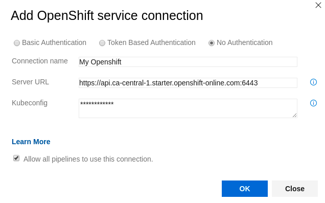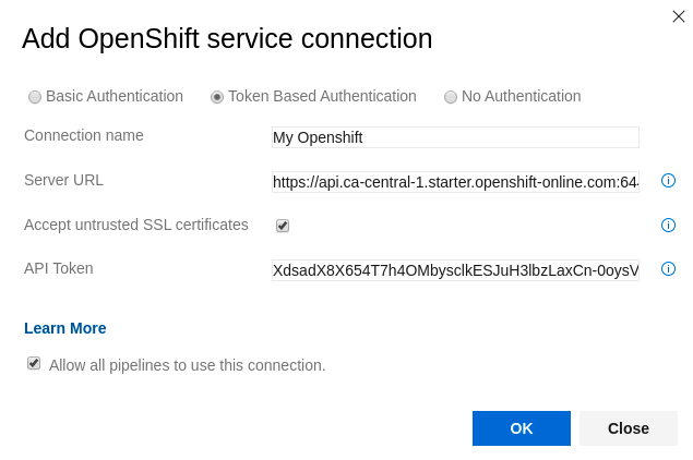 Now, you need to configure the OpenShift service connection, which connects Microsoft Azure DevOps to your OpenShift cluster: