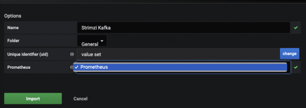 strimzi-kafka.jsonfile fromexamples/metrics/grafana-dashboards/strimzi-kafka.json. - Select Prometheus as a data source and then click Import: