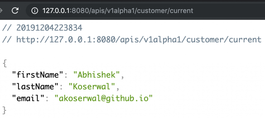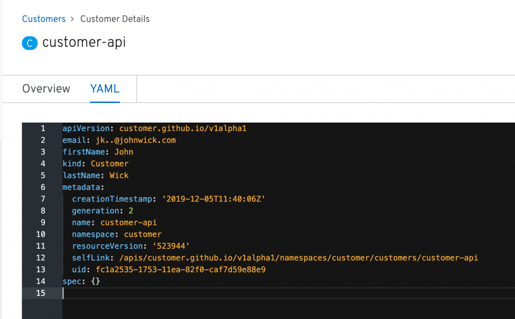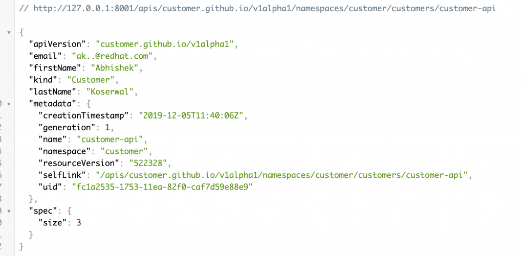 apiVersion: customer.github.io/v1alpha1 kind: Customer metadata: name: customer-api spec: # Add fields here size: 3 firstName: Abhishek lastName: Koserwal email: ak..@redhat.com