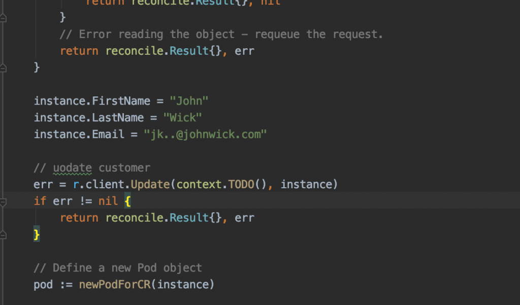 Now, we can add update logic for defining the desired state for our existing Custom Resource. Let’s update the reconciler so it will update our CR (firstName, lastName, and Email) as shown in Figure 14: