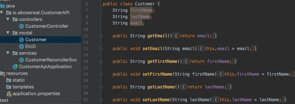 We can start by writing a REST API in the framework that is familiar. I will use Spring Boot for building a simple Customer API. Later, we will write a customer-api-operator that extends Kubernetes' api-server with our defined Customer API. If you are not familiar with Spring Boot, you can continue. The main idea is to understand that writing the API using any language and using the Kubernetes client libraries follows nearly the same pattern.