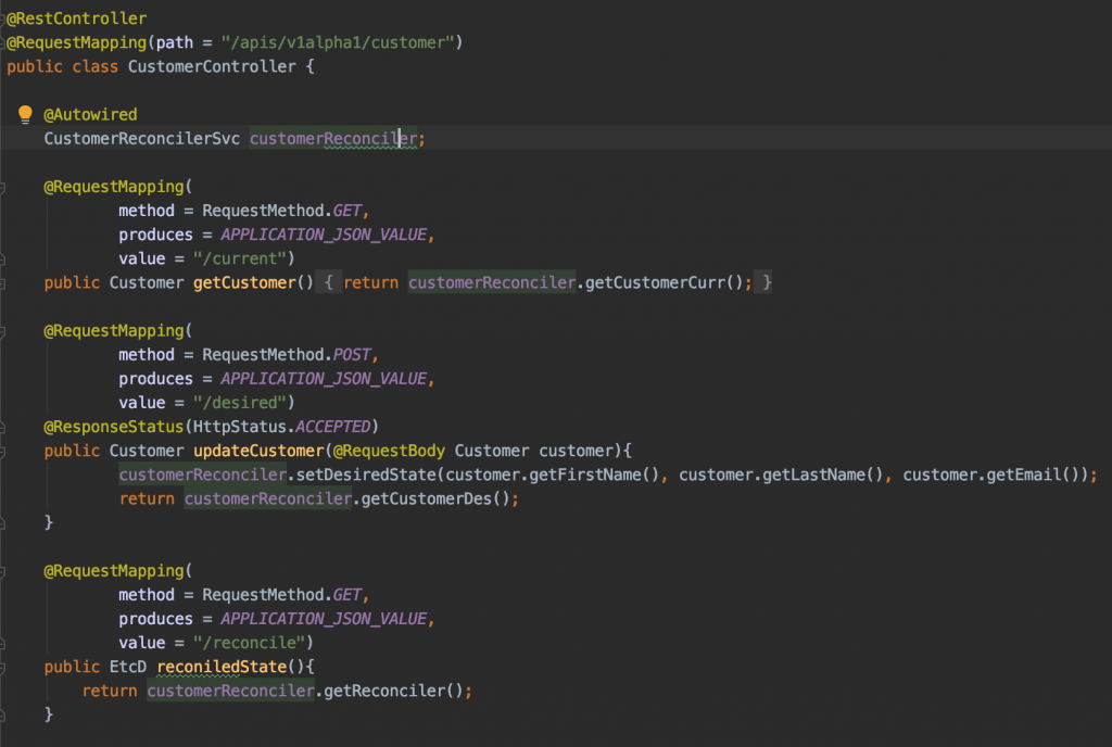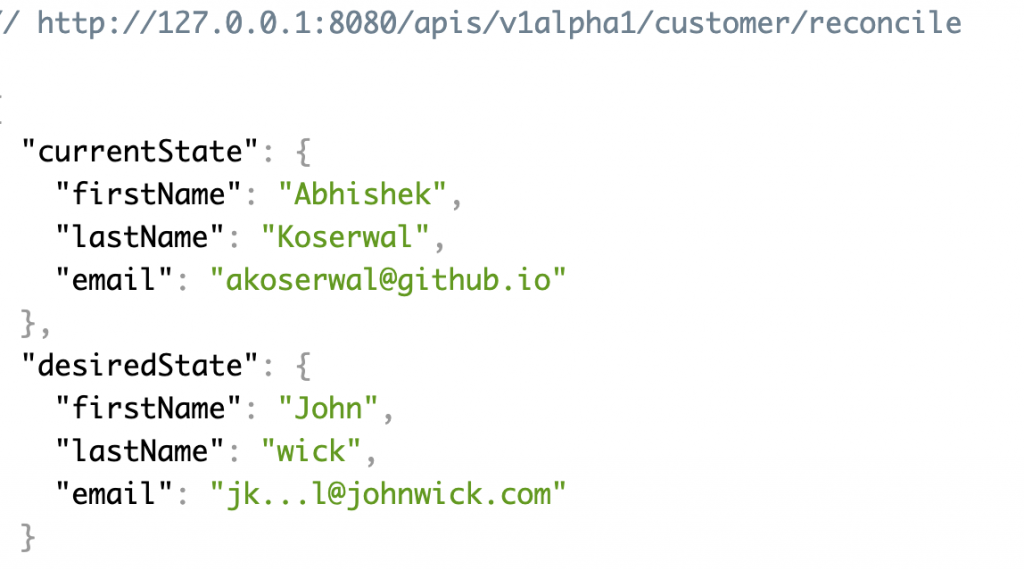 We can relate this result to the Spring Boot example's CustomerController and reconciler endpoint. Although, this version does more than our Spring Boot controller.