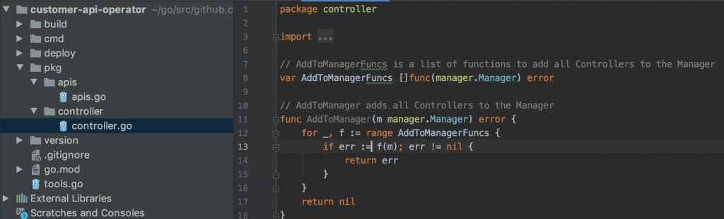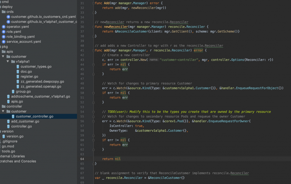 This action generates basic boilerplate code for our Customer API Operator shown in Figure 7:
