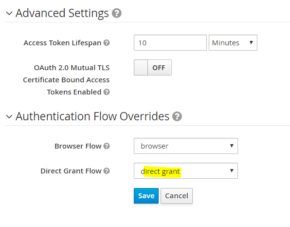 Fill in all of the mandatory fields in the client form. Pay attention, especially, to Direct Grant Flow (shown in Figure 6) and set its value to direct grant. Also, change Access Type to confidential.