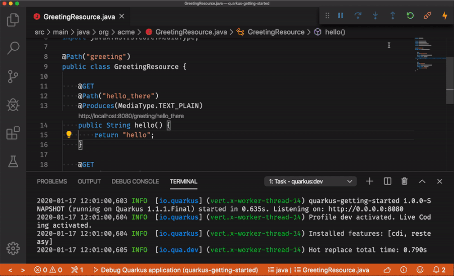When editing a resource class while the current Quarkus application is running in development mode (./mvnw compile quarkus:dev or ./gradlew quarkusDev), there are now CodeLenses that provide the URL for the GET endpoints. This feature takes into account the pathname and the HTTP server port in your application.properties file in order to create the URL.