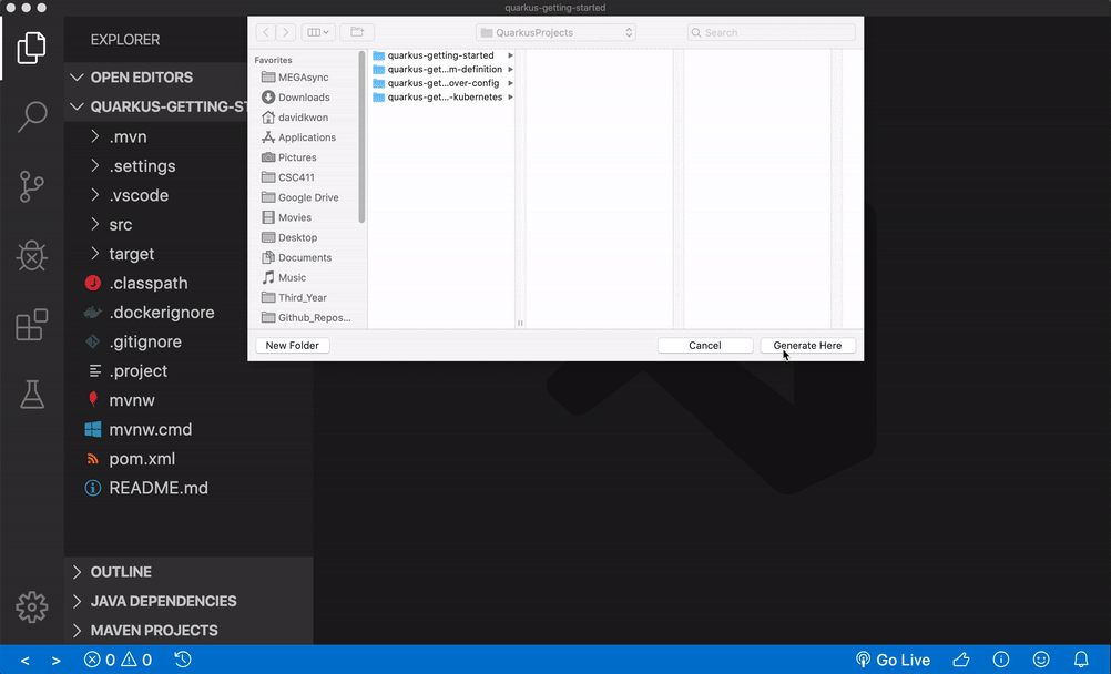 After creating a new project with the Quarkus: Generate a Quarkus project wizard, there is now a new prompt that asks how the new project should be opened. The following before and after diagrams describe the changes: