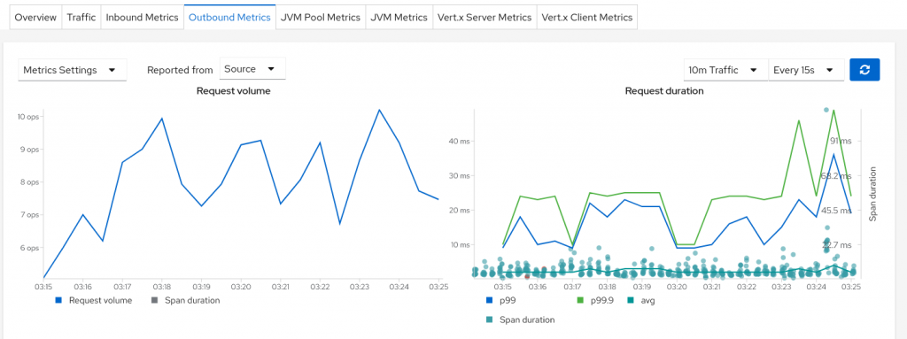In order to do that, each metric chart in Kiali has now a Span duration legend item that, when clicked, shows the spans on that chart as you can see in Figure 1.