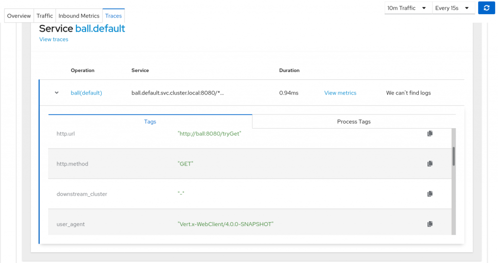 Why spans and not traces? This chart is a service-centric view. We only want to show what is strictly related to the service to better correlate with the displayed metrics, while a trace would encompass calls from other services as well. But be reassured, we can jump from a span to its trace as shown in Figure 2. Kiali now integrates its own traces view along with external links to the Jaeger UI.