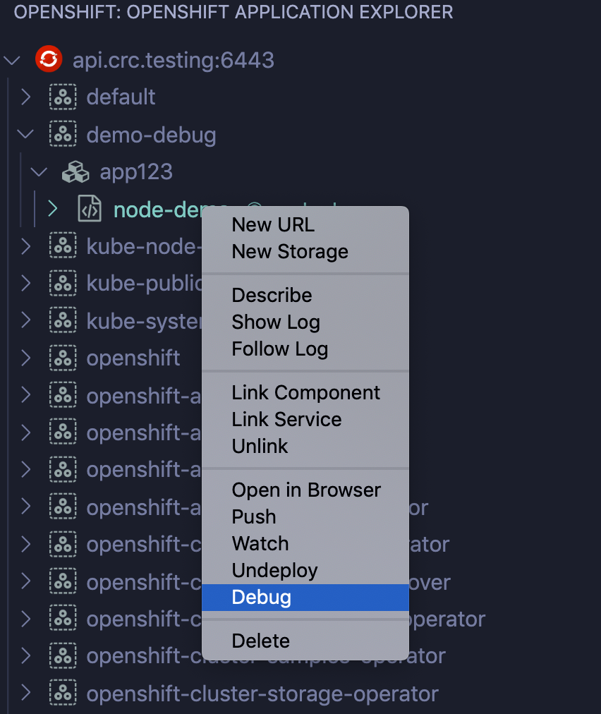 Figure 2: Accessing the OpenShift: Debug command through the OpenShift Application Explorer view.">