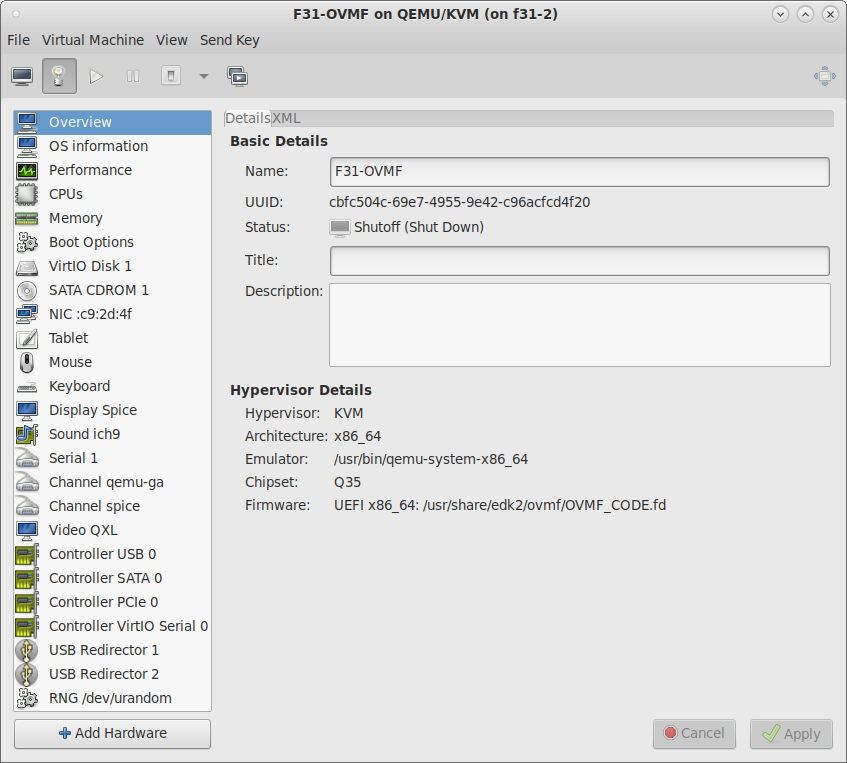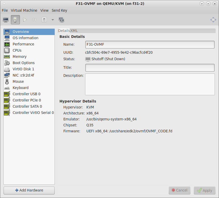 Figure 1 shows the hardware details for a VM that I named F31-OVMF.
