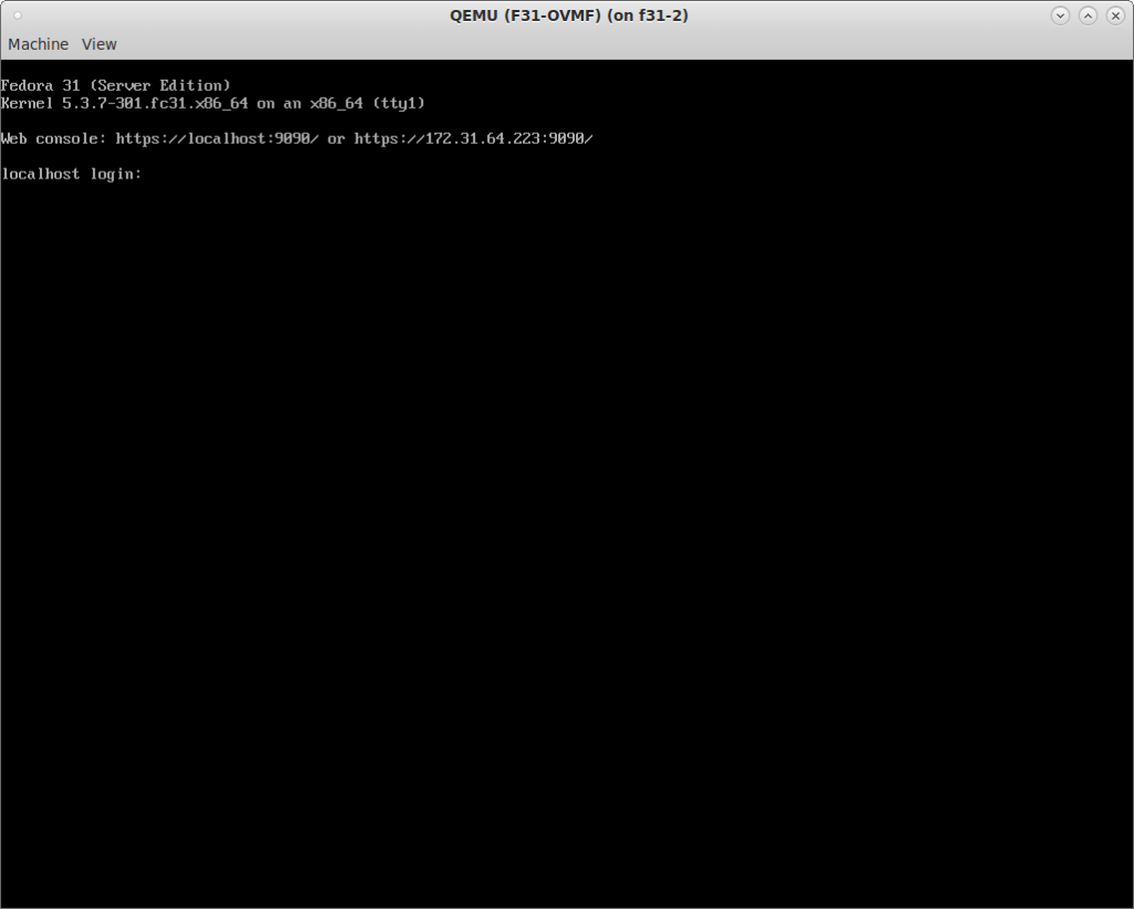 Copy the lines starting from the first environment variable and ending at the bottom of the file. Paste these lines into a new file, skipping any obvious cruft from the bottom of the log file. This will be the script that you run to start the VM as a standalone QEMU environment, so I suggest naming it something like start-<VM>. I named my file start-F31-OVMF.