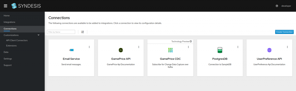 Our goal is to integrate two or more microservices to create a new notification service for a game-store platform. Using Syndesis as our integrated platform-as-a-service (iPaaS) lets us orchestrate existing microservices without writing any code. We assume a microservices architecture where Debezium and Kafka have already been implemented to decouple infrastructure code from the microservices, following an approach similar to the one demonstrated in my previous article.