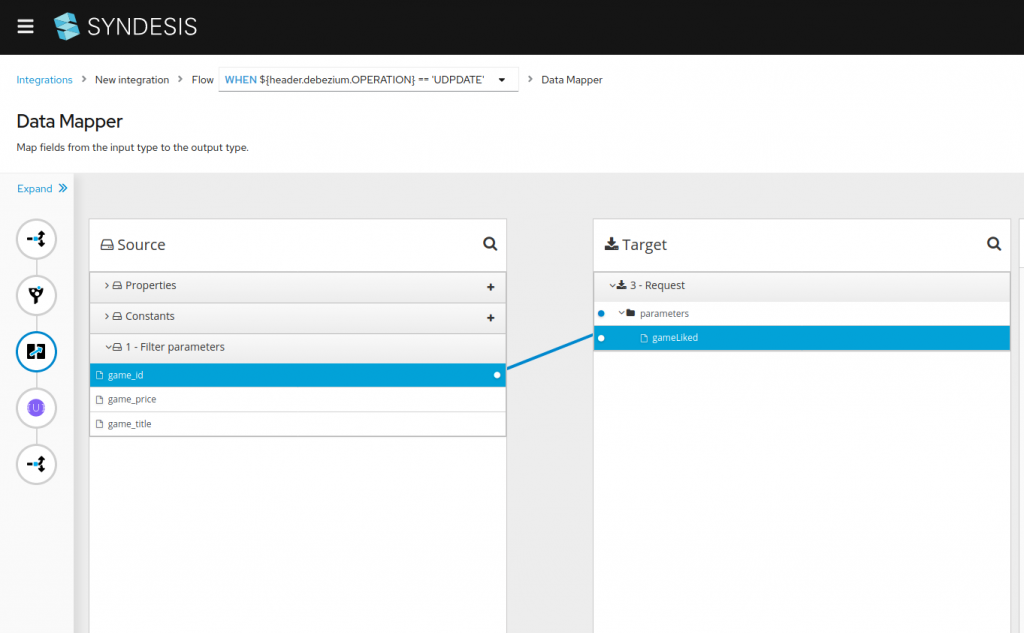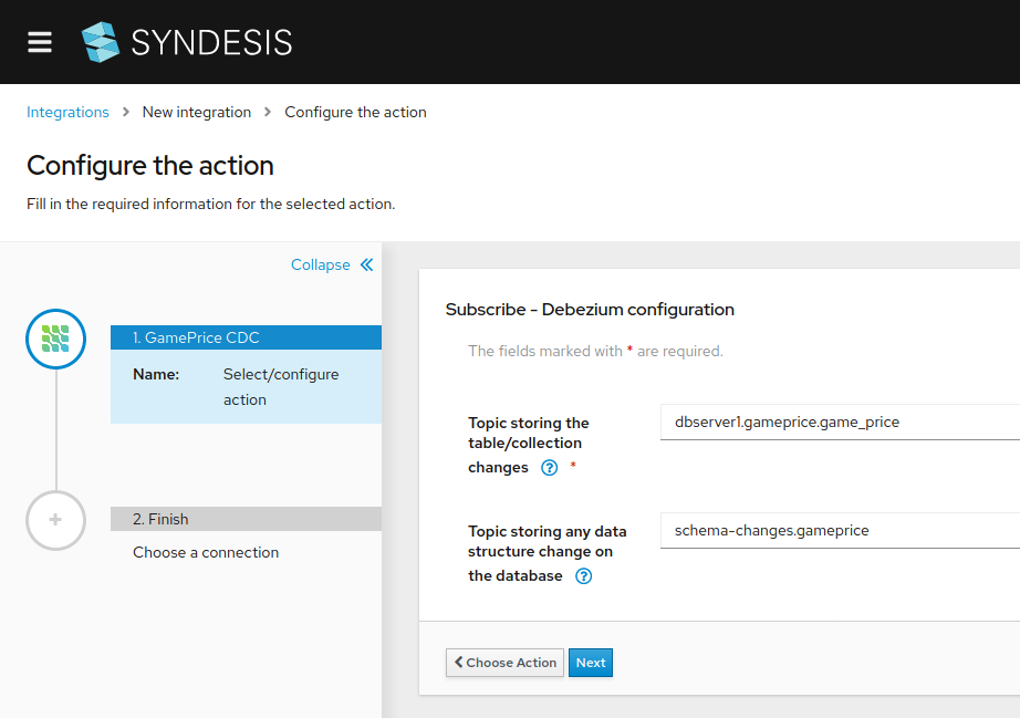 We'll start by selecting the Debezium connector as a source. We select the Kafka topic we need to listen to and a special Kafka topic as shown in Figure 6. Syndesis will use the events produced in the first topic in order to pick the GamePricedrop. It will use the second topic to analyze the event data structure and allow the integrator to map that data to each step in the integration.