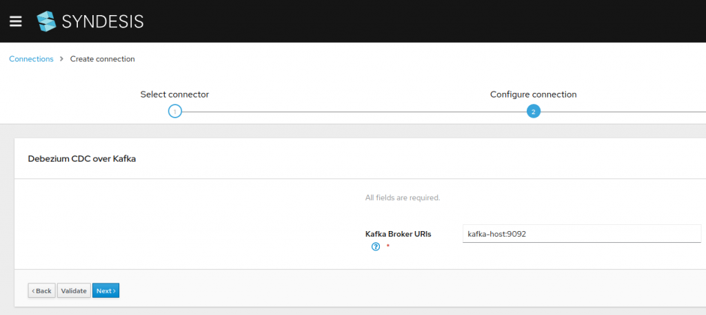 Next, we need to capture changes to price data in the database. We can create event streams to capture such changes. We'll use a Syndesis Debezium connector pointing to a Kafka broker, which we assume has been previously configured. Kafka is the infrastructure used by Debezium to produce change data events. By selecting the broker we will tell Syndesis which events we need to consume. Figure 2 shows this configuration.