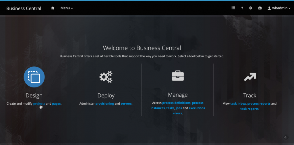 After jBPM has started, open your browser, go to http://localhost:8080/business-central/kie-wb.jsp, and log in as wbadmin with the password wbadmin.