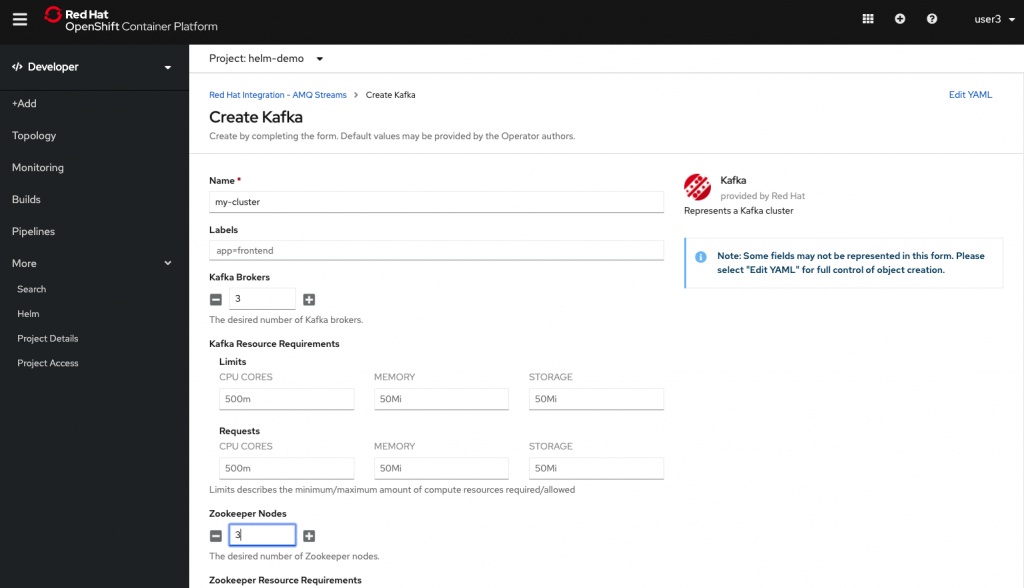 In the +Add navigation section, then select From Catalog to create an Operator-backed service. By default, the Developer Catalog is filtered to display Operator Backed services. Select the one you want to install. You’ll be brought to the YAML editor, but have no fear, you can click on the Edit Form link to follow a guided installation process, as shown in Figure 4.