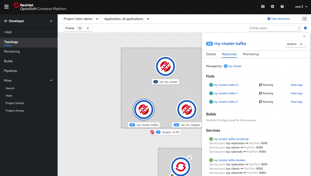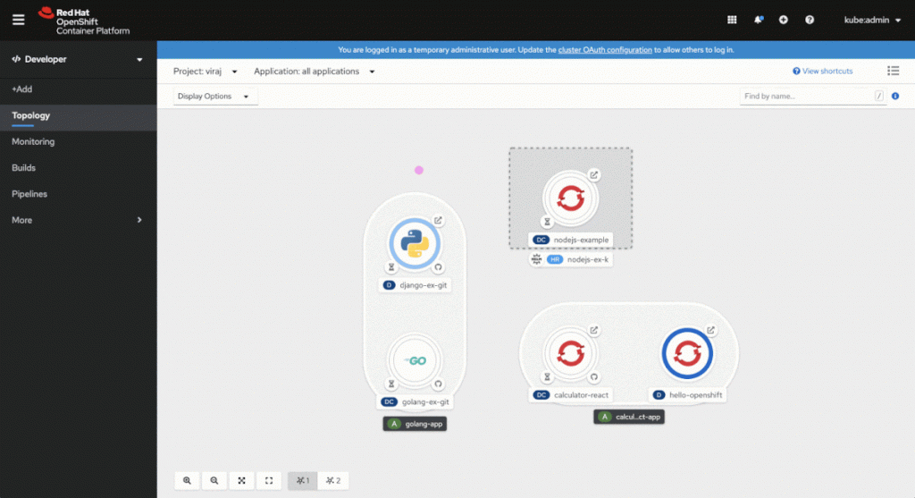 Visually laying out the application structure allows developers to make quick decisions and determine better directions. The ability to quickly access the components from the catalog and link them in their application structure in fewer steps can reduce the time and effort required to enhance or extend an application. To enable this feature, the Topology view now allows developers to add a new resource directly to an application or project from the canvas or to create a relevant contextual binding with an existing component seamlessly.