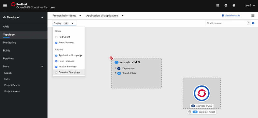 If you prefer a more streamlined layout in Topology view, you can collapse the information about the Operator-backed services by deselecting the checkbox next to Operator Groupings in the Display dropdown menu, as shown in Figure 7.