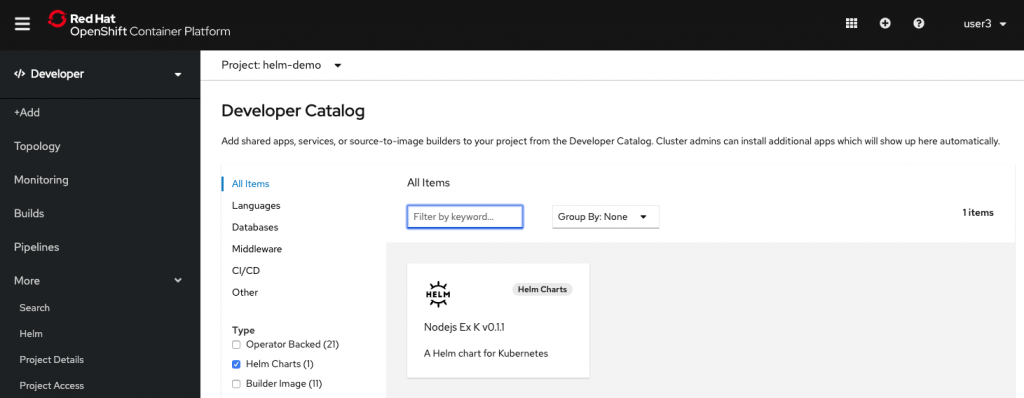 The Developer Catalog now includes Helm charts from a curated repository, as shown in Figure 9, allowing the developer to install a chart by customizing the values.yaml. In a future release of OpenShift, the repository in the Developer Catalog will be configurable.